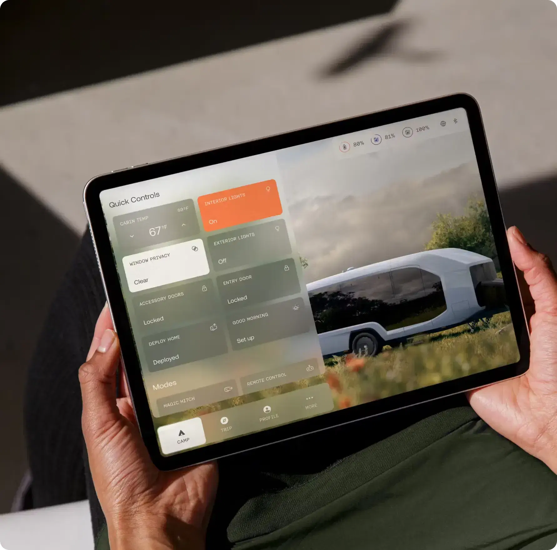 Be camp-ready in seconds, stress-free. With just one touch, watch the leveling stabilizers, stairs, thermostat and lights automatically set-up camp for you.