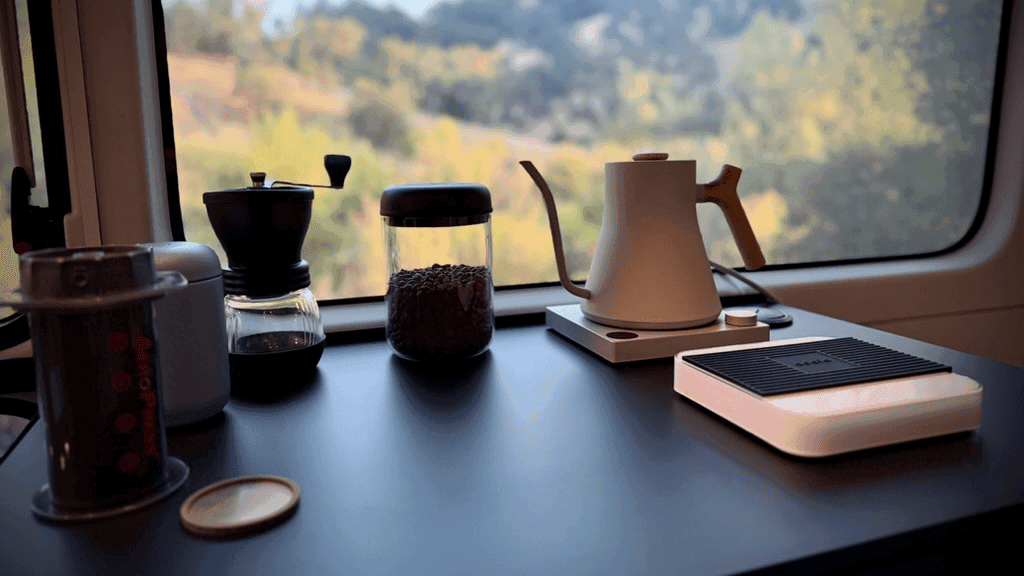 Pebble: Anything you wish Pebble had? Jared: Blackout curtains! Our son goes to bed early, and while the smart glass is great for privacy, it doesn’t block light completely. The team has been responsive, though — we got magnetic curtains for the front, which help a lot. (* Blackout curtains are now available via the Pebble website) I also really appreciate the bed and lounge configuration. The bed is smaller than our Airstream’s but far more comfortable. Lounge mode is our favorite — the three of us can sprawl out, watch a movie on the projector, or play board games. It’s cozy and social, something our old RV never managed. And the kitchen layout is outstanding. The galley feels more spacious than our Airstream, even if it isn’t, and the sink and fridge are larger. Our old fridge struggled over 100°F; Pebble’s stays cold no matter what. That alone is worth a lot to us.