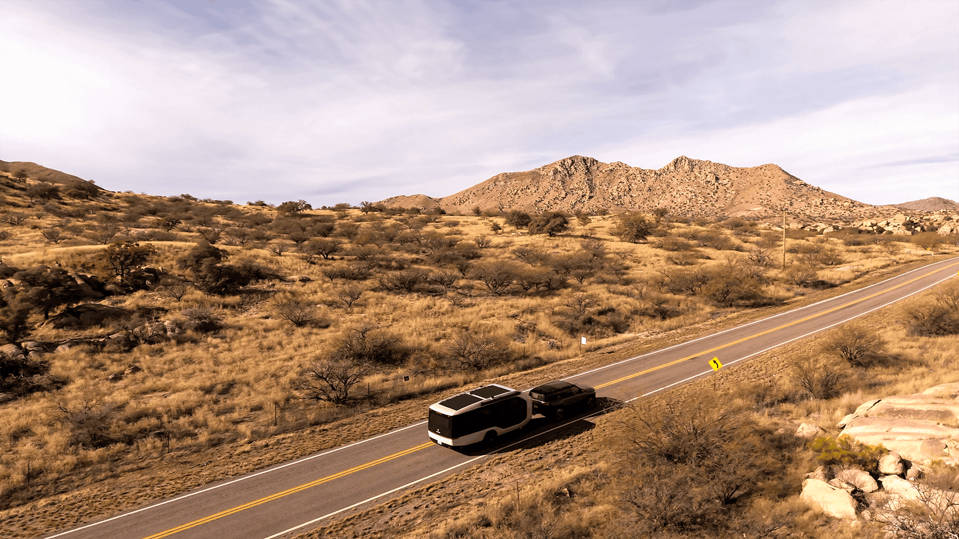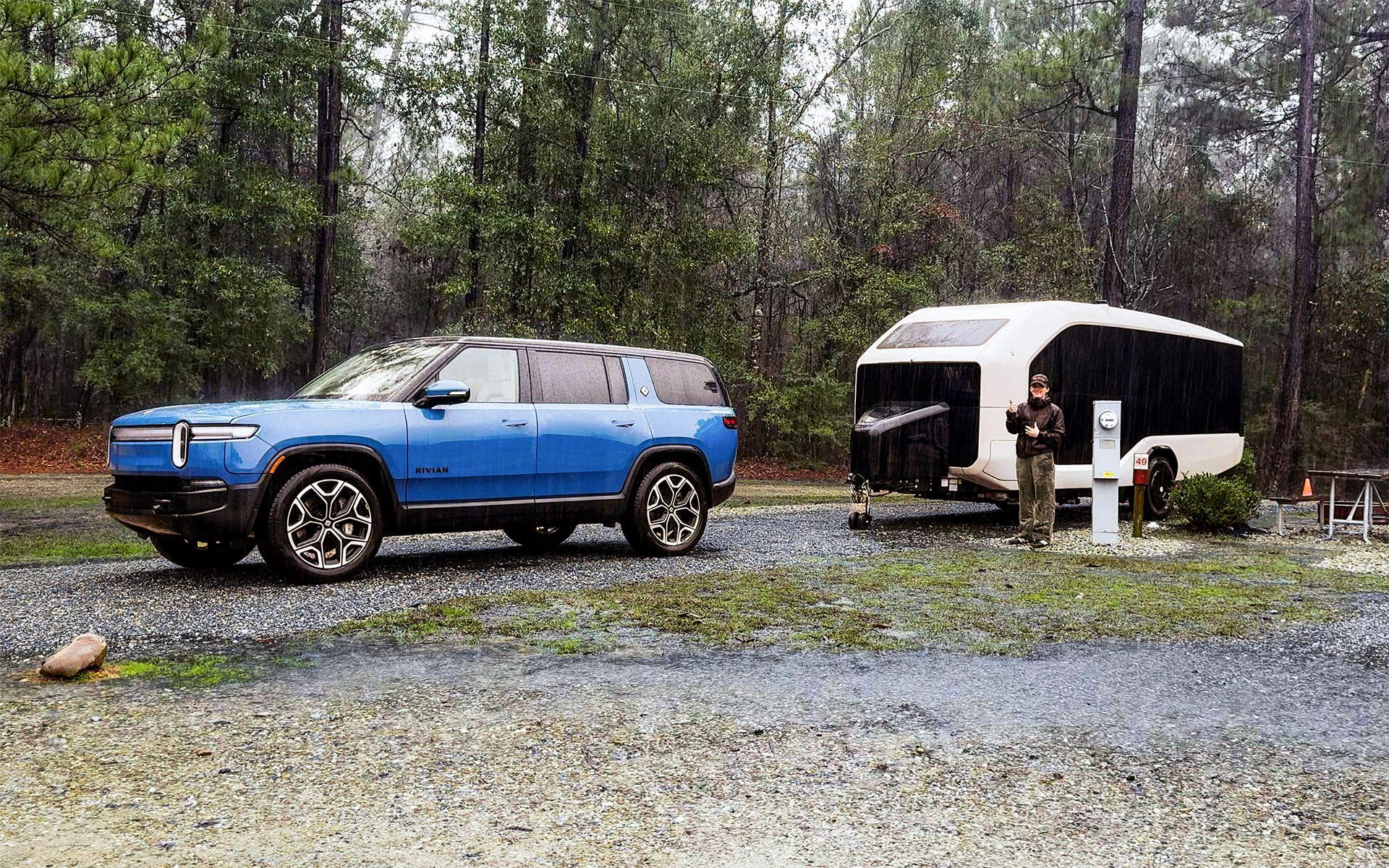 At one point Waze routed us off the freeway and onto a dirt road, which is not exactly ideal while towing. Mud splashed up on both vehicles, but Flow stayed stable and easy to control behind our R1S tow vehicle. A few miles later, back on the highway, the rain intensified and effectively power-washed everything clean. Then the clouds broke and revealed a double rainbow. It felt like the universe was telling us we were on the right track.